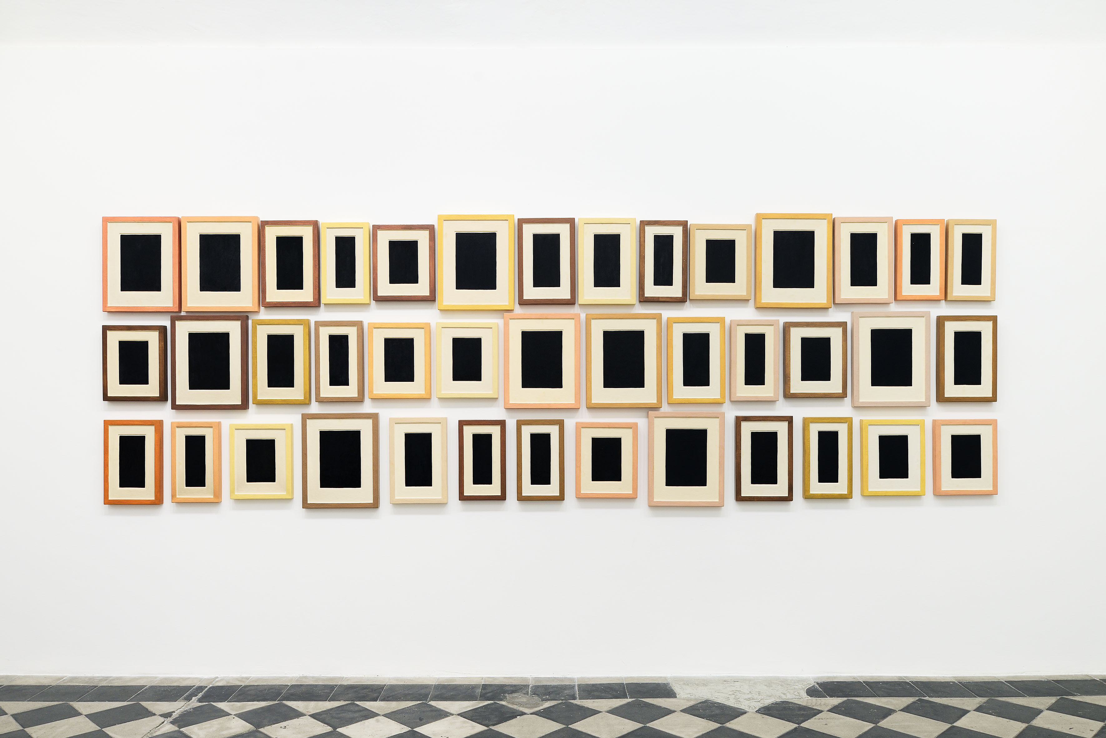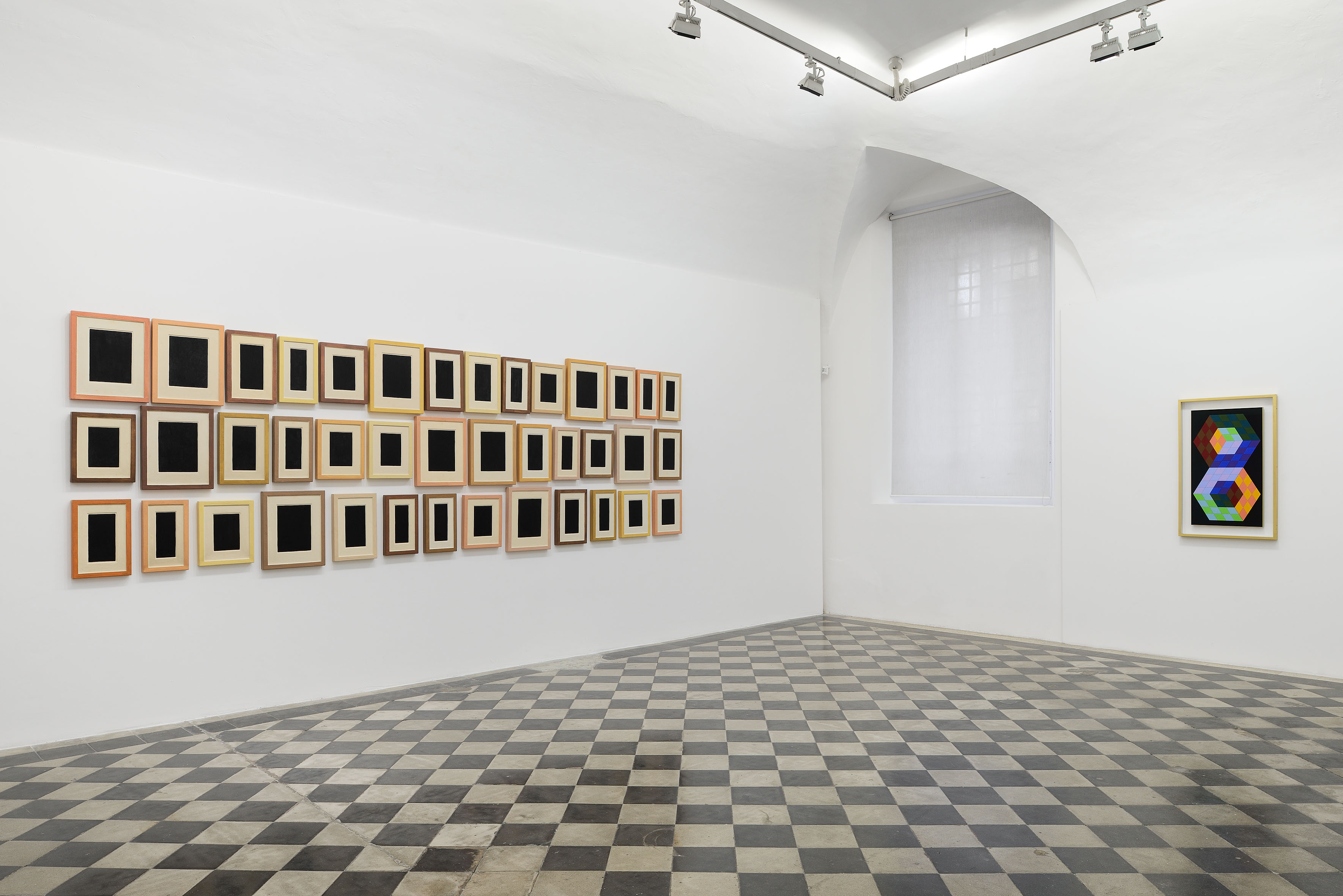 A more insistent rhythm distinguishes the works of Enrico Castellani and Allan McCollum. Castellani’s Superficie bianca (2007) recalls the spatialist research of the Azimuth group, leading the viewer through the opening carved by Lucio Fontana and followed by Agostino Bonalumi, Piero Manzoni, and Castellani himself, toward a new way of conceiving the presence and vitality of the artwork. The indistinct flow generated with order through the extroflections practiced by the Venetian artist appears at once delicate and assertive in affirming the work’s presence in space. At the opposite pole of Castellani’s optical white, Allan McCollum stages the seriality of contemporary society through the dense black of his Forty Plaster Surrogates No. 4 (1990). Here, the grid becomes synonymous with standardization, with mass production pushed to the point of alienation, in an installation solution that powerfully echoes the idea of modularity and interchangeability of components, all different and all seemingly identical.