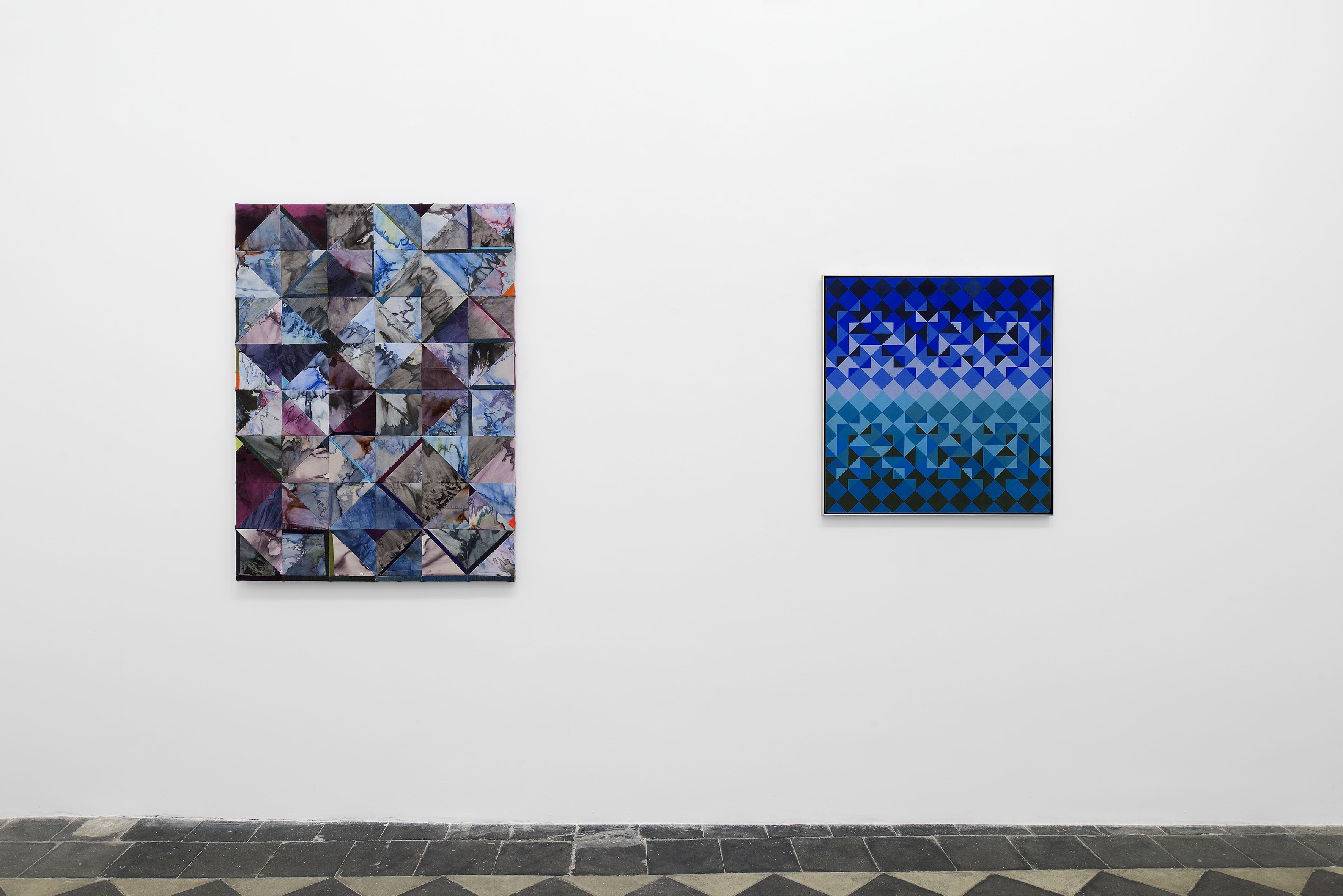Through the recent works of Jonathan VanDyke and Sean Shanahan, the transformation affecting the idea of the “grid” reaches the present in two completely opposite outcomes. For Shanahan, the modularity of the works and their tone-on-tone chromatic pairings constitute a near-ascetic narrative nullification; for VanDyke, by contrast, the grid becomes a technical and meditation device for social storytelling that reflects on the passage of time and transformation of materials through slow, quiet, long processes: scraps of clothing worn by people close to him are sewn together as a testament to a reunited fragmentation, a grid once again welded back together.