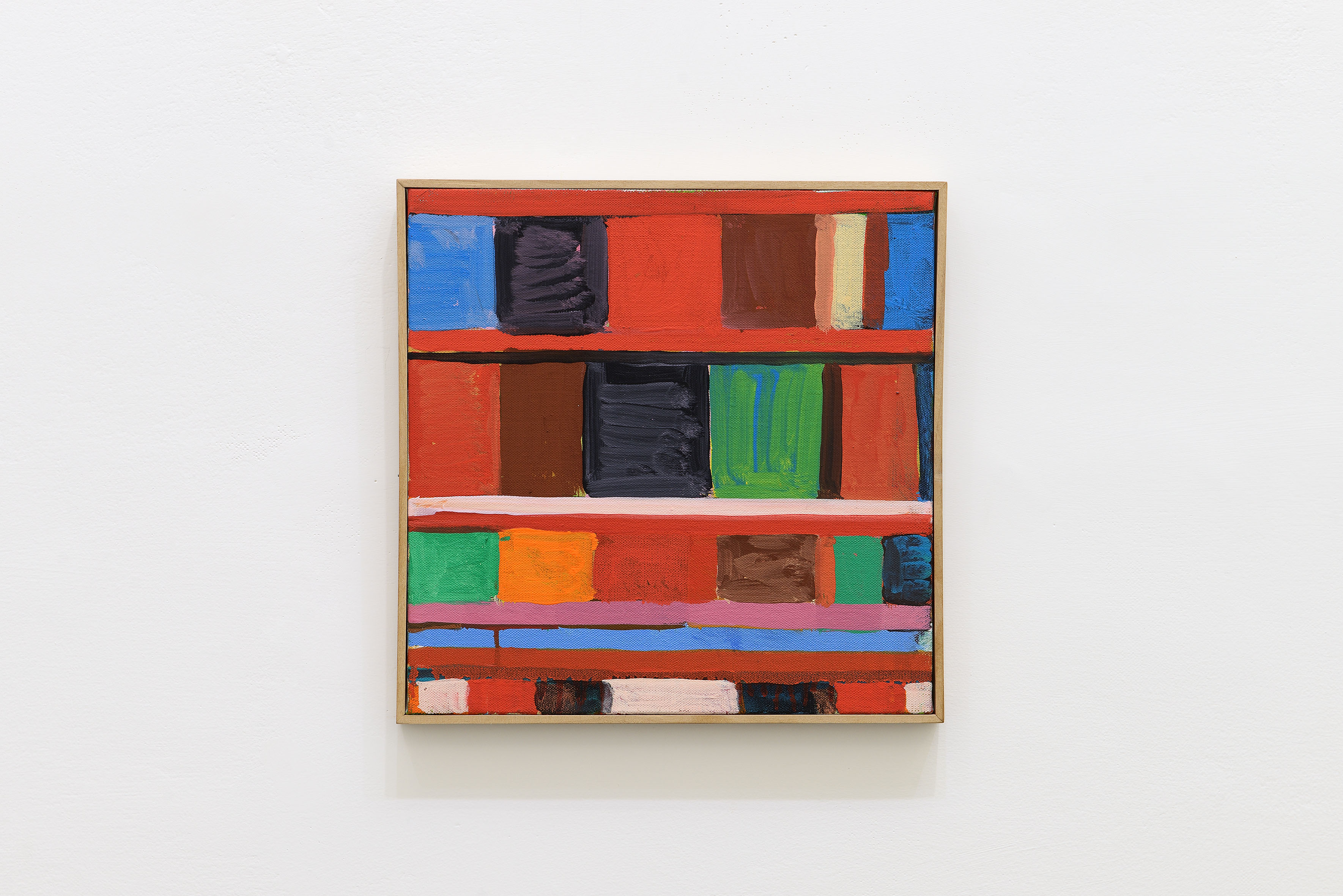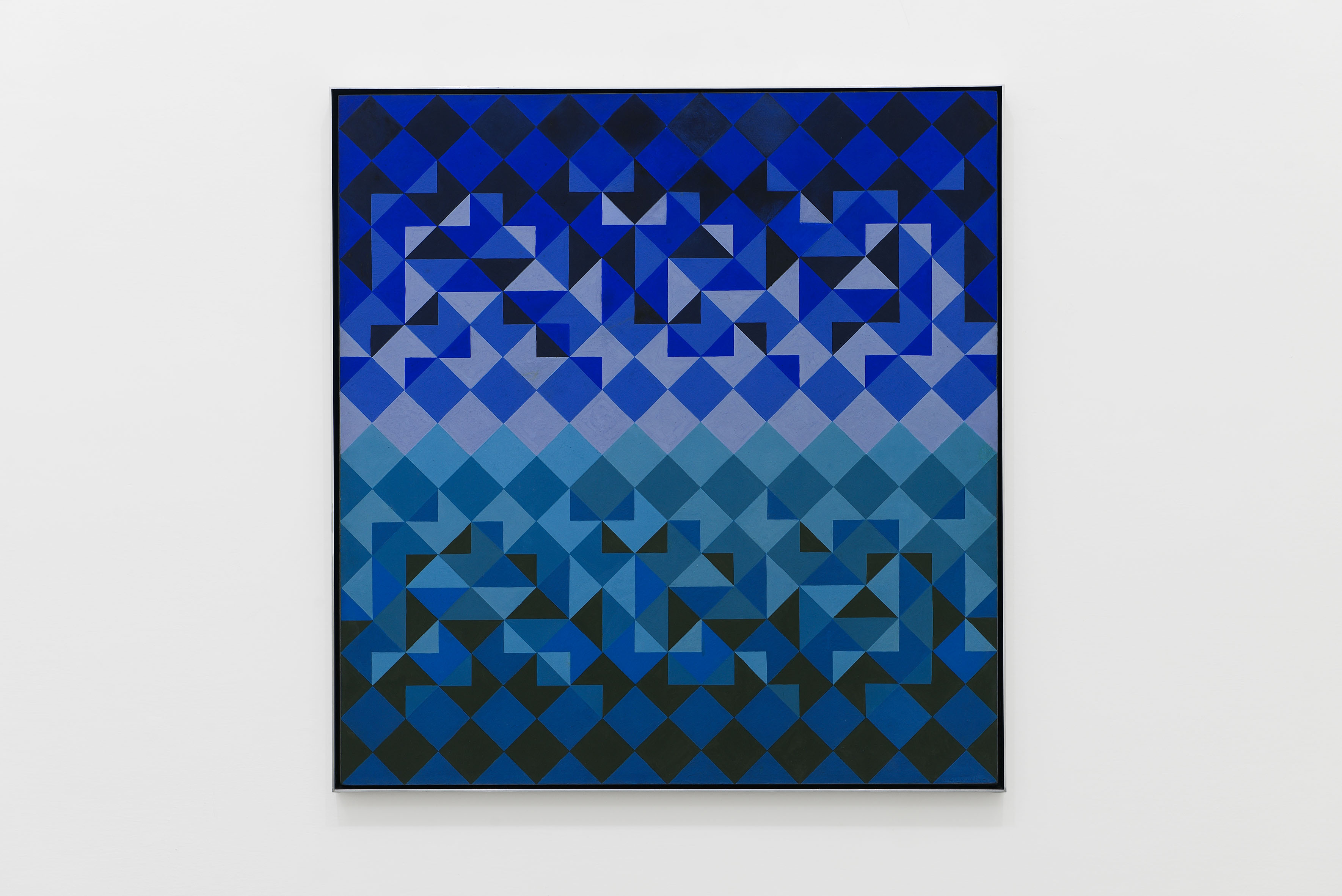 A key to understanding the exhibition concept, SAT – Foresta impigliata by Sergio Lombardo came to life in 1993 as part of the SAT cycle, within the broader framework of Stochastic Painting codified by the Roman master beginning in 1980. The large work, composed of four modules, establishes an important methodological precedent both in Lombardo’s research – where he uses double-toroid figures for the first time – and in the dehumanization of pictorial and compositional technique. This methodical and cyclical mode of inquiry reappears in two works by Victor Vasarely, Turkiz (1962) and Tridim – + – (1968–72), clear examples of the attempt to deconstruct geometric abstraction in the direction of Optical Art (Op Art), of which Vasarely was a pioneer and precise theorist, as further confirmed by the publication of his Yellow Manifesto. The “grid” thus becomes the expression of a theoretical framework upon which to construct painting, starting, especially in Lombardo, from an initial criterion of randomness. This same openness to an ordered chaos emerges in the work of Stanley Whitney and Bernard Frize. Whitney, while consciously avoiding the idea of a schema, finds himself inadvertently drawn into it through the application of the dense color fields in Stay Song Series 6 (2004), which alternate like a jazz improvisation. Frize, on the other hand, exploits the very potential of constraint through the “all over” technique, covering the entire surface of the canvas. The resulting paintings are composed of semi-random forms, echoing the Surrealists’ concept of “objective chance” and Claude Lévi-Strauss’s anthropological notion of “bricolage.”